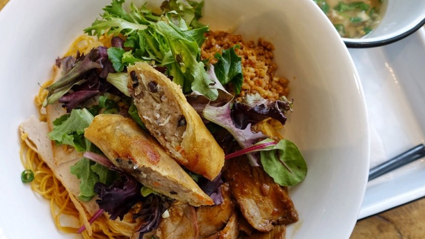 Each bowl is made with two kinds of noodles: rice noodles and egg noodles. The noodles are given a quick boil, tossed in kalbi and saté sauces, which combined create a flavour bomb that is savoury, spicy, and a little sweet. The noodles are then topped with three kinds of pork from char siu, ground pork, and Vietnamese ham. Greens, herbs, and a fried spring roll add contrast to the rich noodles.