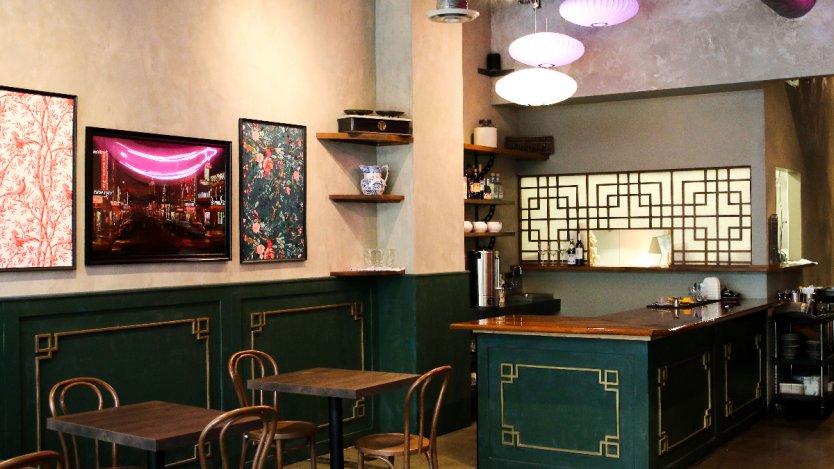 With the cusp-of-autumn reopening comes an updated meu as well as a dynamic new interior. Framed ornate patterned graphics on sea green walls with gold accents and dark wood tabletops and chairs are meant to draws inspiration from historic Shanghai.