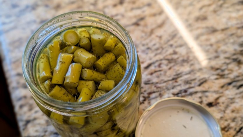 Jar of Edgar Farms pickled asparagus bits with dill and garlic