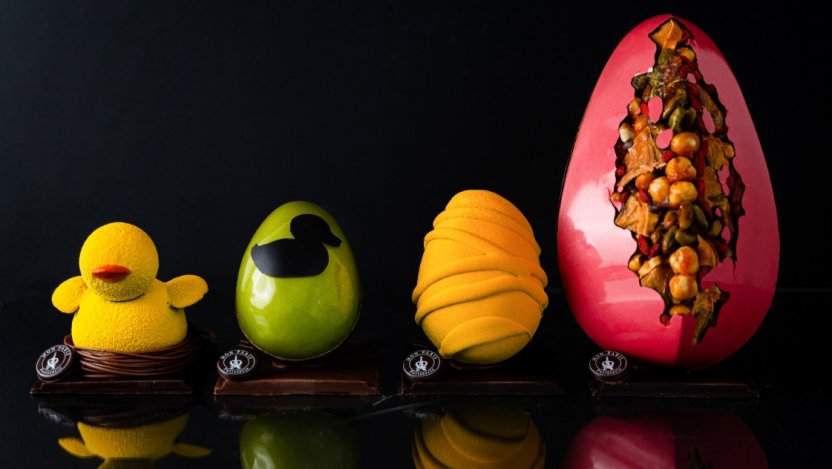 Another visually-stunning collection, Mon Paris Pâtisserie’s Easter offerings include colourful chocolate and velvet eggs, fruit and nut-filled eggs, raspberry caramel-filled milk chocolate lollipops, and adorable chocolate ducklings.