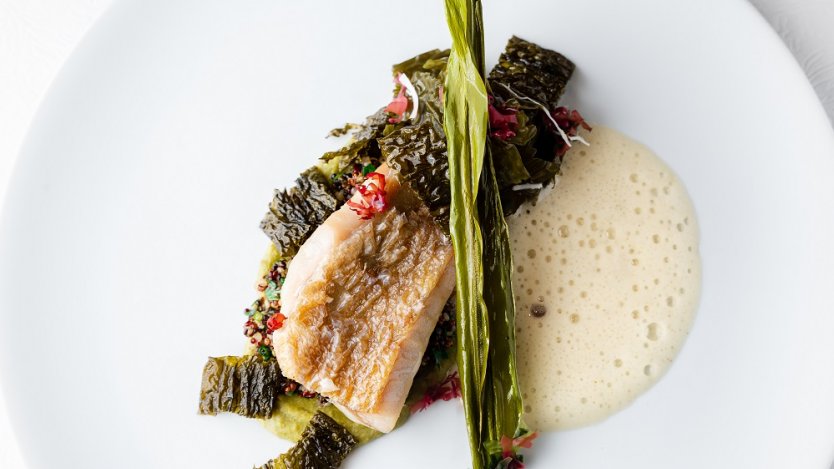 “This dish is inspired by the ocean,” explains Bacchus Restaurant chef de cuisine Jason Baker. “The rockfish represents the predictor, which can be found in and around the seaweed bed. The quinoa is to represent the ocean seabed and Kombu bubbles represent the ocean spray. The seaweed is not only the key ingredient to this dish but it also represents the natural food chain from the rockfish who feasts on the seaweed.”