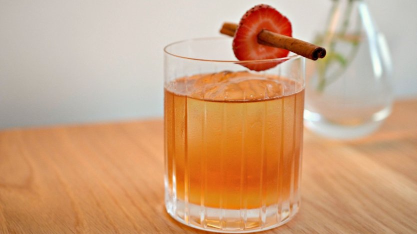 Add all ingredients except strawberry slice and cinnamon stick into a mixing glass. Add ice.