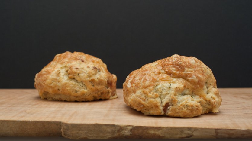 Thomas Haas Chocolates & Pâtisserie is well known for its fine chocolates, stollen and cakes, but this savoury scone is the perfect thing to bake on a cold winter day. To ensure the butter is at the right temperature, chill cubed butter in freezer 15 minutes before mixing.