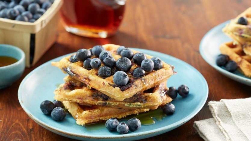 Add more crunch and flavour to your waffles by using part cornmeal in the batter. Since it's the summer, add a handful of B.C. blueberries to make the waffles even better.