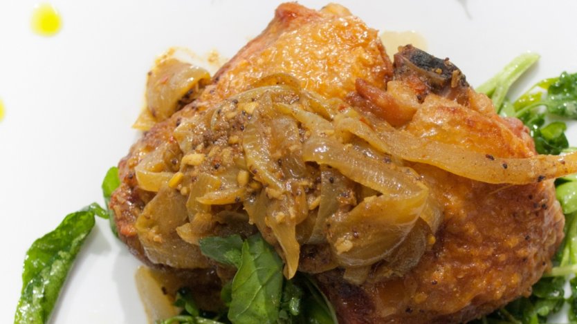 Season the chicken thighs with salt and freshly ground pepper. Add them to the pan, and toss to coat in the sauce. Bake, uncovered, for 35 to 40 minutes. (After 20 minutes, check that the sauce is still covering the chicken, adding small amounts of water as needed.)