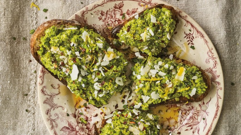 Spread each piece of toast with the pea mixture and top with a shaving of pecorino, a sprinkle of lemon zest, chopped mint, some chili flakes, and a drizzle of olive oil.