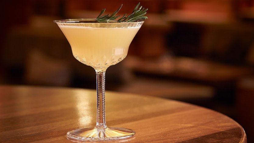 In a cocktail shaker filled with ice, shake ingredients together, and pour into coupe glass. Serve neat, and garnish with rosemary.