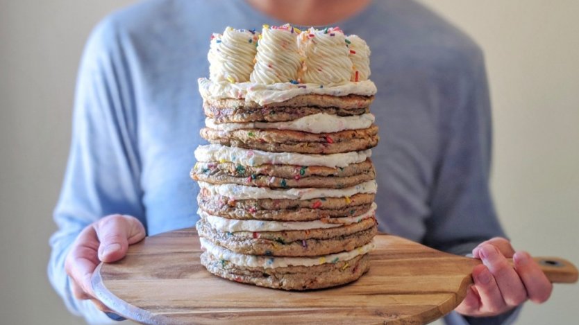 Though we might not have the icing piping skills of chef Hiebert, we can still offer the fundamentals of building an amazing layer cake using pancakes.