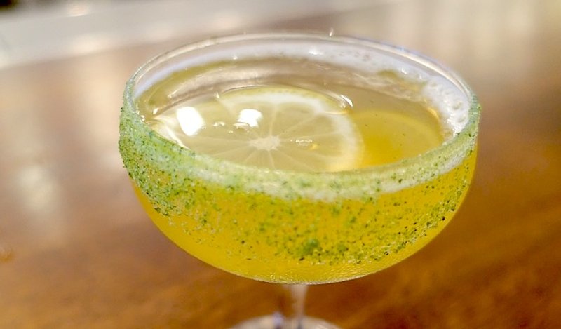 Single strain into a coupe glass with a half rim of sugar/shiso mix.