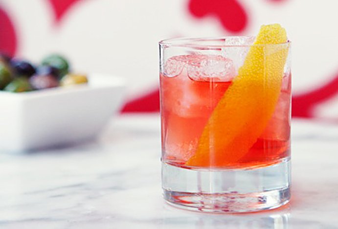 Garnish with a long strip of grapefruit peel, squeezing the citrus oils over the top of the cocktail before dropping the peel into the drink.