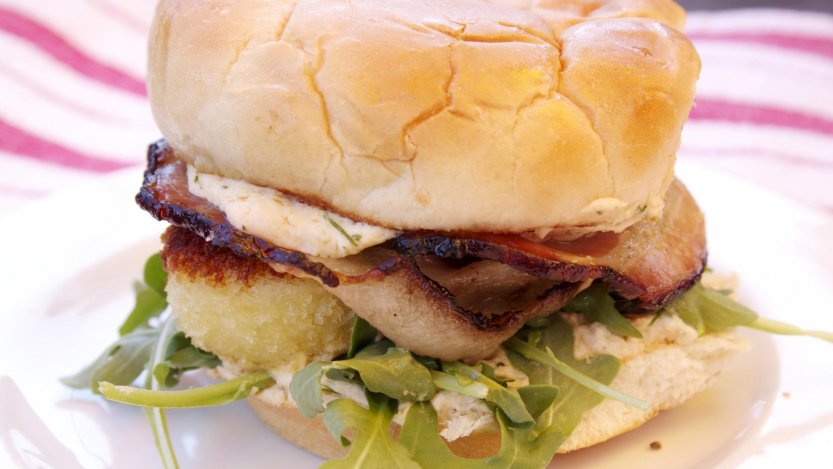 To assemble the burgers, place the bottom part of the bun down and spread 1 tbsp of the cream cheese tartar sauce on the bun. Place 4 or 5 crispy sea scallops over sauce, then lay 2 pieces of bacon rounds on top of scallops. Next, add several arugula lettuce leaves. On the top of the bun, spread another tablespoon of cream cheese tartar sauce, and place the bun on top.