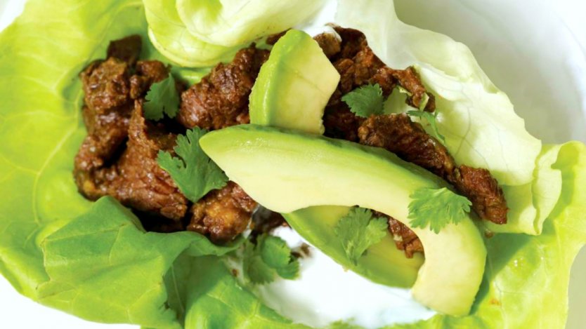 To garnish, place the meat and the garnishes in serving dishes and set them on the table. Everyone can top their lettuce leaves with sour cream, meat, avocado, and cilantro and then simply roll and enjoy.
