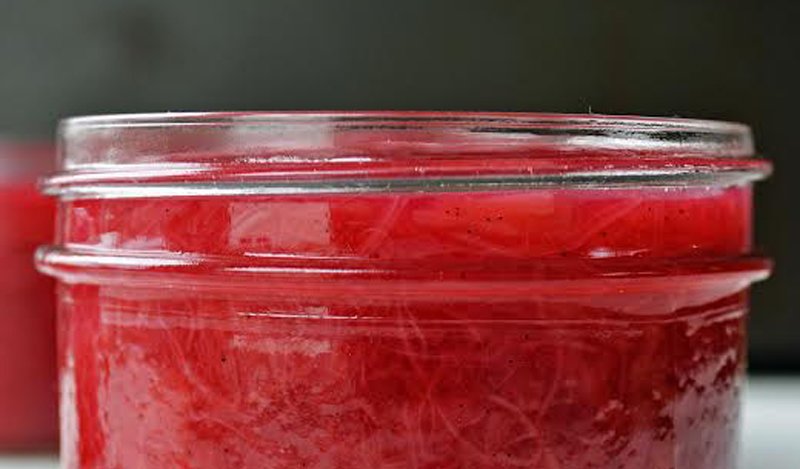 "Old-fashioned stewed rhubarb goes from casual comfort to dazzling dessert with the addition of tiny black vanilla seeds. There’s not much you can put in a jar that’s tastier or more beautiful than simple stewed rhubarb." -- Amy Bronee.
