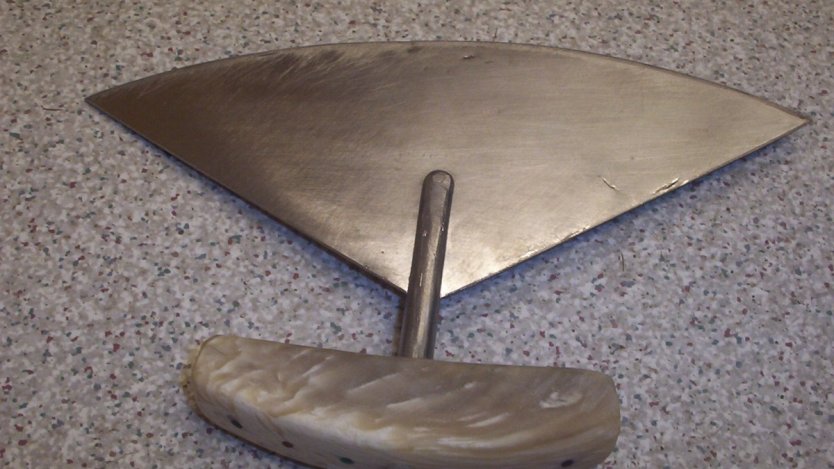 Traditionally made from caribou antler, muskox horn, or the ivory from a walrus, the half circle shape of this unique tool makes cutting easier because of the force being concentrated in the centre, while the round edge allows for a rocking motion to cut through hard objects like bone.