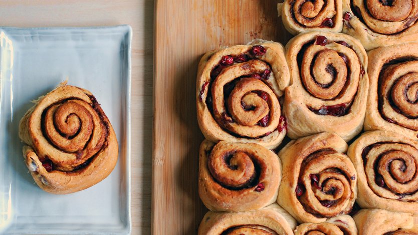 To assemble, spread filling in an even layer over dough. Scatter cranberries over filling, and roll the dough up tightly along the long end into a log. Cut into 12 equal pieces and transfer to a 6×12 inch (or similar-sized) baking dish, with swirl facing up. Cover with a tea towel and let rise for 1 hour.