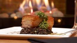 Moist roasted turkey meat inside pork belly with Cascade Celery Bitters and pumpkin seed salsa verde