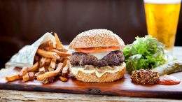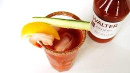 A cocktail recipe with craft Caesar mix, vodka, lager, and garnished with maple and candied salmon or caribou jerky.