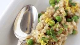 Barley risotto with lemon, leeks and peas